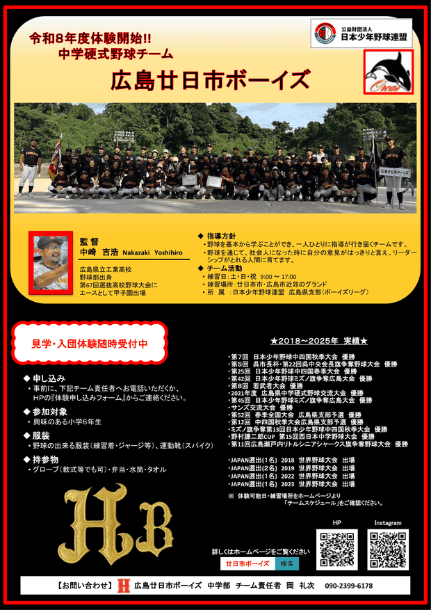広島廿日市ボーイズでは2026年(令和8年)4月入団の新入団員の募集を行ってます。合同体験会などは行いませんので、興味のある方は「チームスケジュール」をご確認いただき「体験申し込みフォーム」よりご連絡ください。お気軽にお問合せのうえ体験練習にご参加ください。